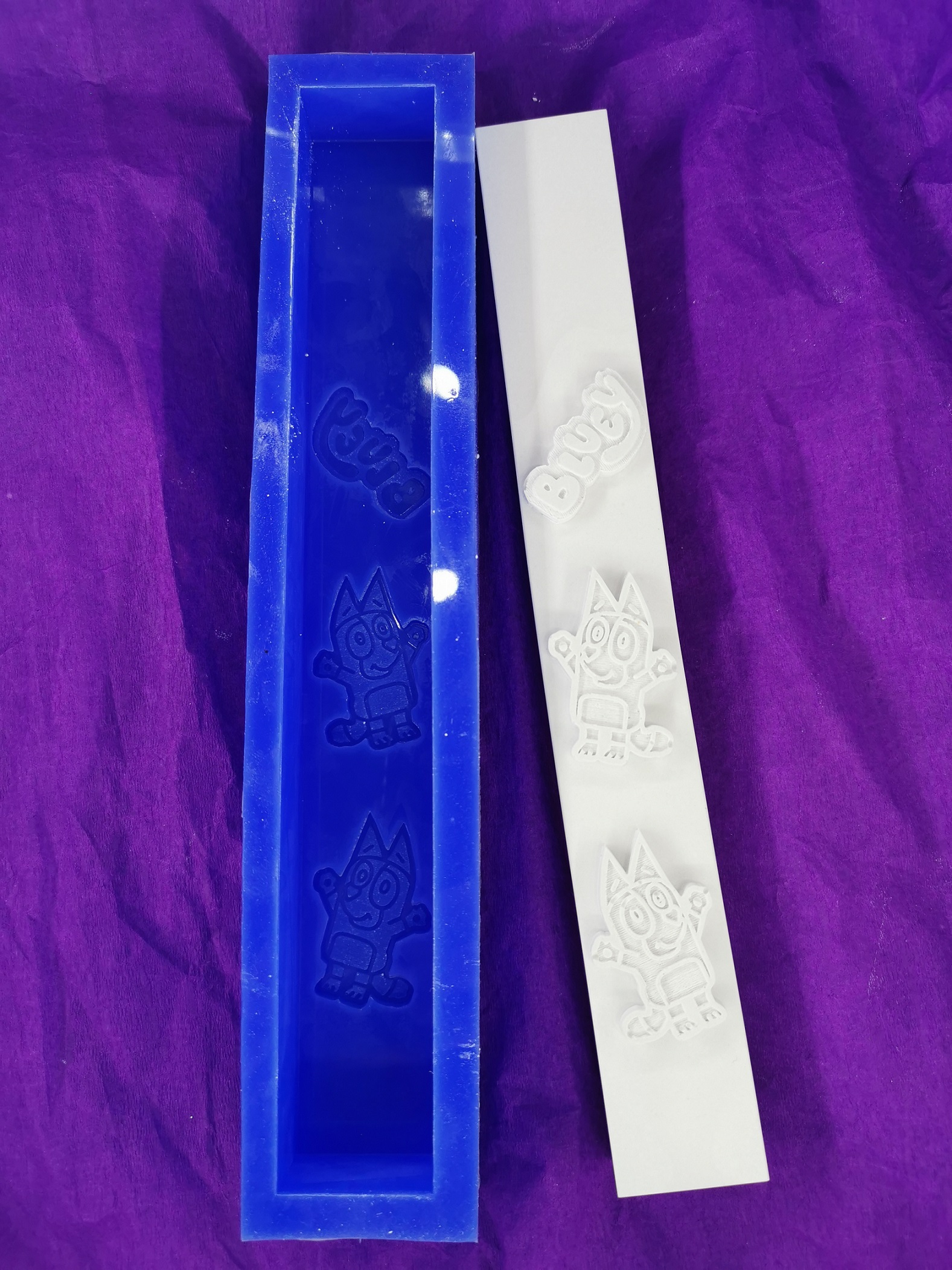 Χειροποίητο καλούπι σιλικόνης υψηλής ποιότητας με τριπλό αποτύπωμα του αγαπημένου παιδικού χαρακτήρα Bluey και το λογότυπο.